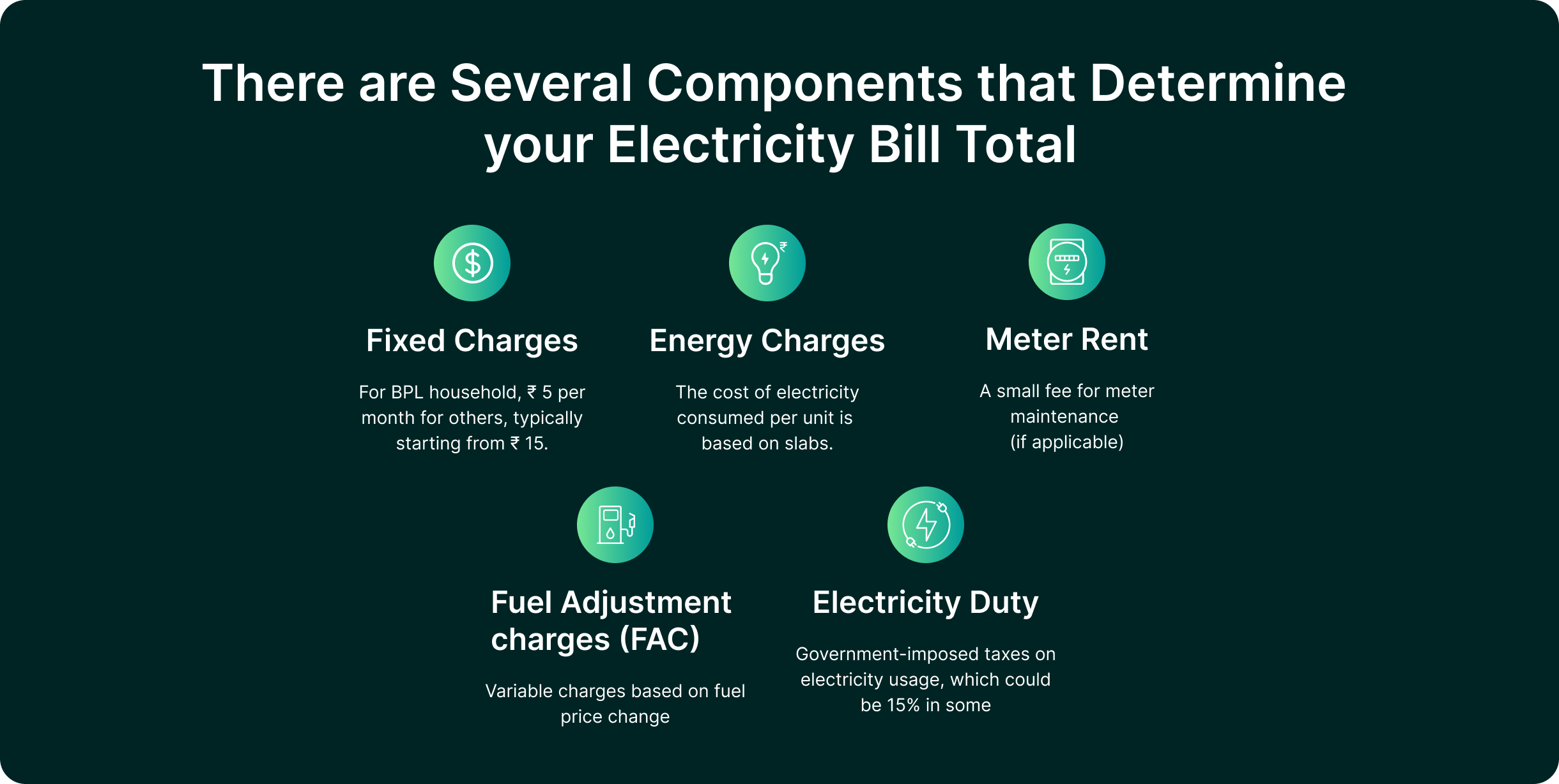 There are several components that determine your electricity bill total, including:- Fixed Charges: These are fees based on your connection type, which typically starts from ₹ 15 and may vary. However, for BPL household consumers, the fixed prices remain ₹ 5 per month.